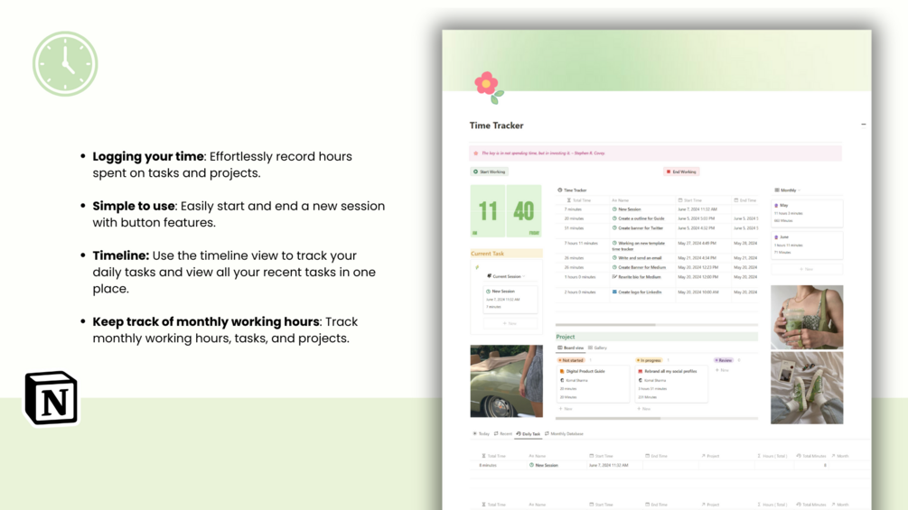 Keep track of your working hours easily with the time tracker Notion template. ⏰