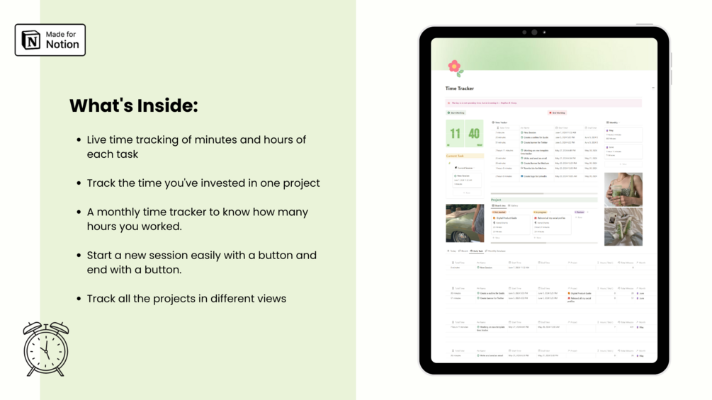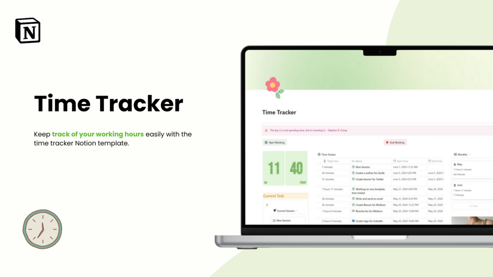 Keep track of your working hours easily with the time tracker Notion template. ⏰
